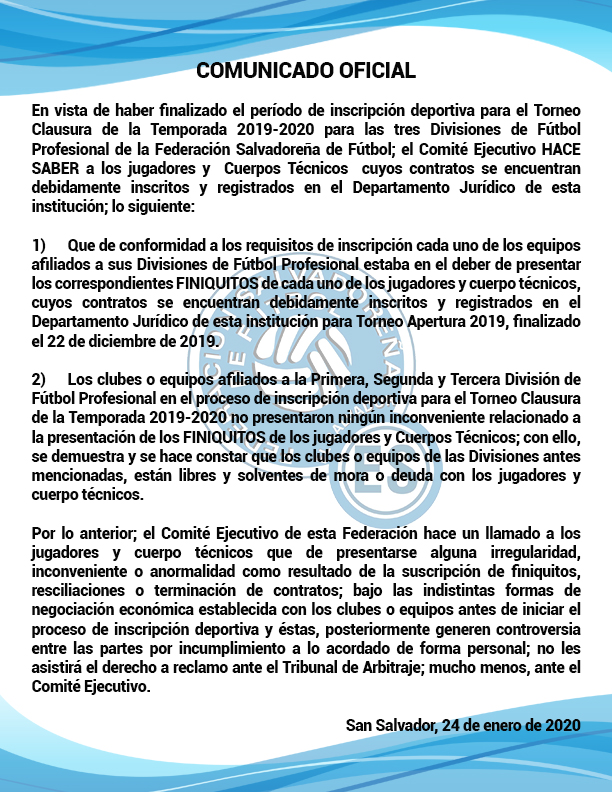 En vista de haber finalizado el período de inscripción deportiva para el Torneo Clausura de la Temporada 2019-2020 para las tres Divisiones de Fútbol Profesional de la Federación Salvadoreña de Fútbol; el Comité Ejecutivo HACE SABER a los jugadores y Cuerpos Técnicos cuyos contratos se encuentran debidamente inscritos y registrados en el Departamento Jurídico de esta institución; lo siguiente: 1) Que de conformidad a los requisitos de inscripción cada uno de los equipos afiliados a sus Divisiones de Fútbol Profesional estaba en el deber de presentar los correspondientes FINIQUITOS de cada uno de los jugadores y cuerpo técnicos, cuyos contratos se encuentran debidamente inscritos y registrados en el Departamento Jurídico de esta institución para Torneo Apertura 2019, finalizado el 22 de diciembre de 2019. 2) Los clubes o equipos afiliados a la Primera, Segunda y Tercera División de Fútbol Profesional en el proceso de inscripción deportiva para el Torneo Clausura de la Temporada 2019-2020 no presentaron ningún inconveniente relacionado a la presentación de los FINIQUITOS de los jugadores y Cuerpos Técnicos; con ello, se demuestra y se hace constar que los clubes o equipos de las Divisiones antes mencionadas, están libres y solventes de mora o deuda con los jugadores y cuerpo técnicos. Por lo anterior; el Comité Ejecutivo de esta Federación hace un llamado a los jugadores y cuerpo técnicos que de presentarse alguna irregularidad, inconveniente o anormalidad como resultado de la suscripción de finiquitos, resciliaciones o terminación de contratos; bajo las indistintas formas de negociación económica establecida con los clubes o equipos antes de iniciar el proceso de inscripción deportiva y éstas, posteriormente generen controversia entre las partes por incumplimiento a lo acordado de forma personal; no les asistirá el derecho a reclamo ante el Tribunal de Arbitraje; mucho menos, ante el Comité Ejecutivo. San Salvador, 24 de enero de 2020