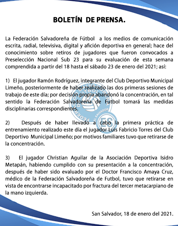 La Federación Salvadoreña de Fútbol a los medios de comunicación escrita, radial, televisiva, digital y afición deportiva en general; hace del conocimiento sobre retiros de jugadores que fueron convocados a Preselección Nacional Sub 23 para su evaluación de esta semana comprendida a partir del 18 hasta el sábado 23 de enero del 2021; así: