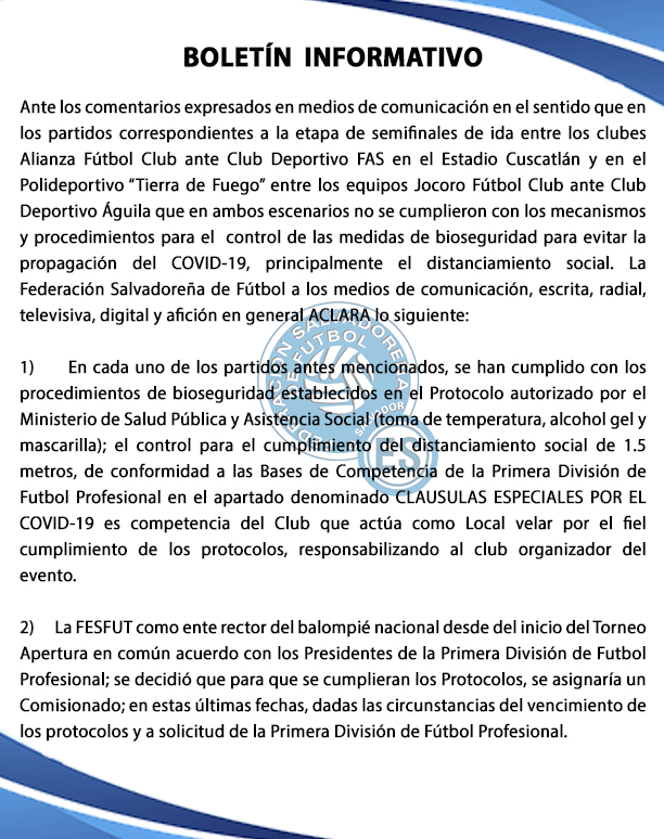 Ante los comentarios expresados en medios de comunicación en el sentido que en los partidos correspondientes a la etapa de semifinales de ida entre los clubes Alianza Fútbol Club ante Club Deportivo FAS en el Estadio Cuscatlán y en el Polideportivo “Tierra de Fuego” entre los equipos Jocoro Fútbol Club ante Club Deportivo Águila que en ambos escenarios no se cumplieron con los mecanismos y procedimientos para el control de las medidas de bioseguridad para evitar la propagación del COVID-19, principalmente el distanciamiento social. La Federación Salvadoreña de Fútbol a los medios de comunicación, escrita, radial, televisiva, digital y afición en general ACLARA lo siguiente: