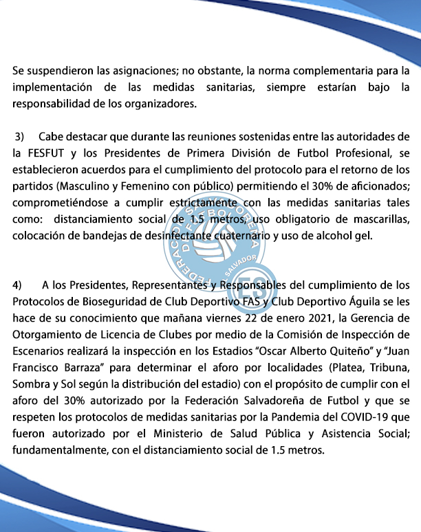 4) A los Presidentes, Representantes y Responsables del cumplimiento de los Protocolos de Bioseguridad de Club Deportivo FAS y Club Deportivo Águila se les hace de su conocimiento que mañana viernes 22 de enero 2021, la Gerencia de Otorgamiento de Licencia de Clubes por medio de la Comisión de Inspección de Escenarios realizará la inspección en los Estadios “Oscar Alberto Quiteño” y “Juan Francisco Barraza” para determinar el aforo por localidades (Platea, Tribuna, Sombra y Sol según la distribución del estadio) con el propósito de cumplir con el aforo del 30% autorizado por la Federación Salvadoreña de Futbol y que se respeten los protocolos de medidas sanitarias por la Pandemia del COVID-19 que fueron autorizado por el Ministerio de Salud Pública y Asistencia Social; fundamentalmente, con el distanciamiento social de 1.5 metros.