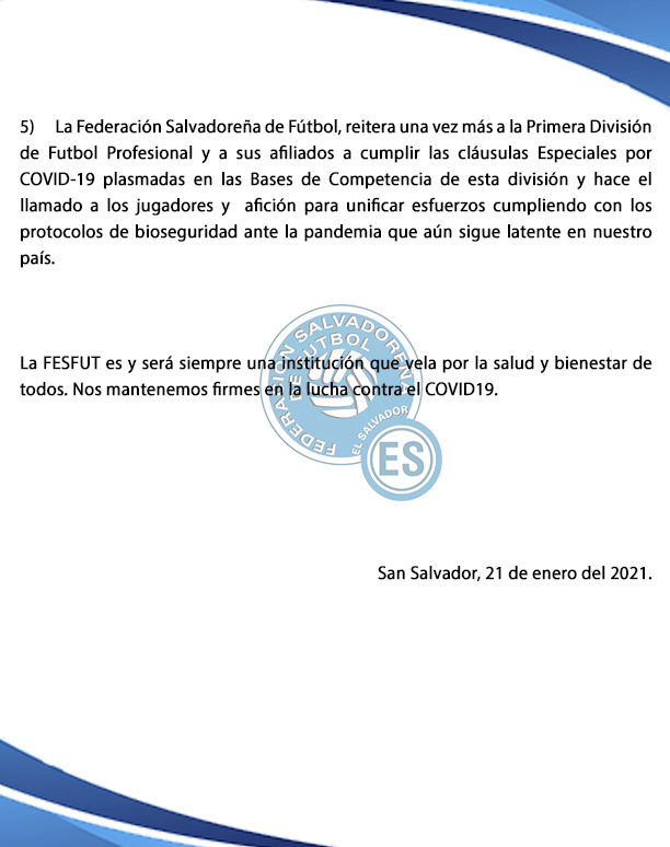 5) La Federación Salvadoreña de Fútbol, reitera una vez más a la Primera División de Futbol Profesional y a sus afiliados a cumplir las cláusulas Especiales por COVID-19 plasmadas en las Bases de Competencia de esta división y hace el llamado a los jugadores y afición para unificar esfuerzos cumpliendo con los protocolos de bioseguridad ante la pandemia que aún sigue latente en nuestro país.