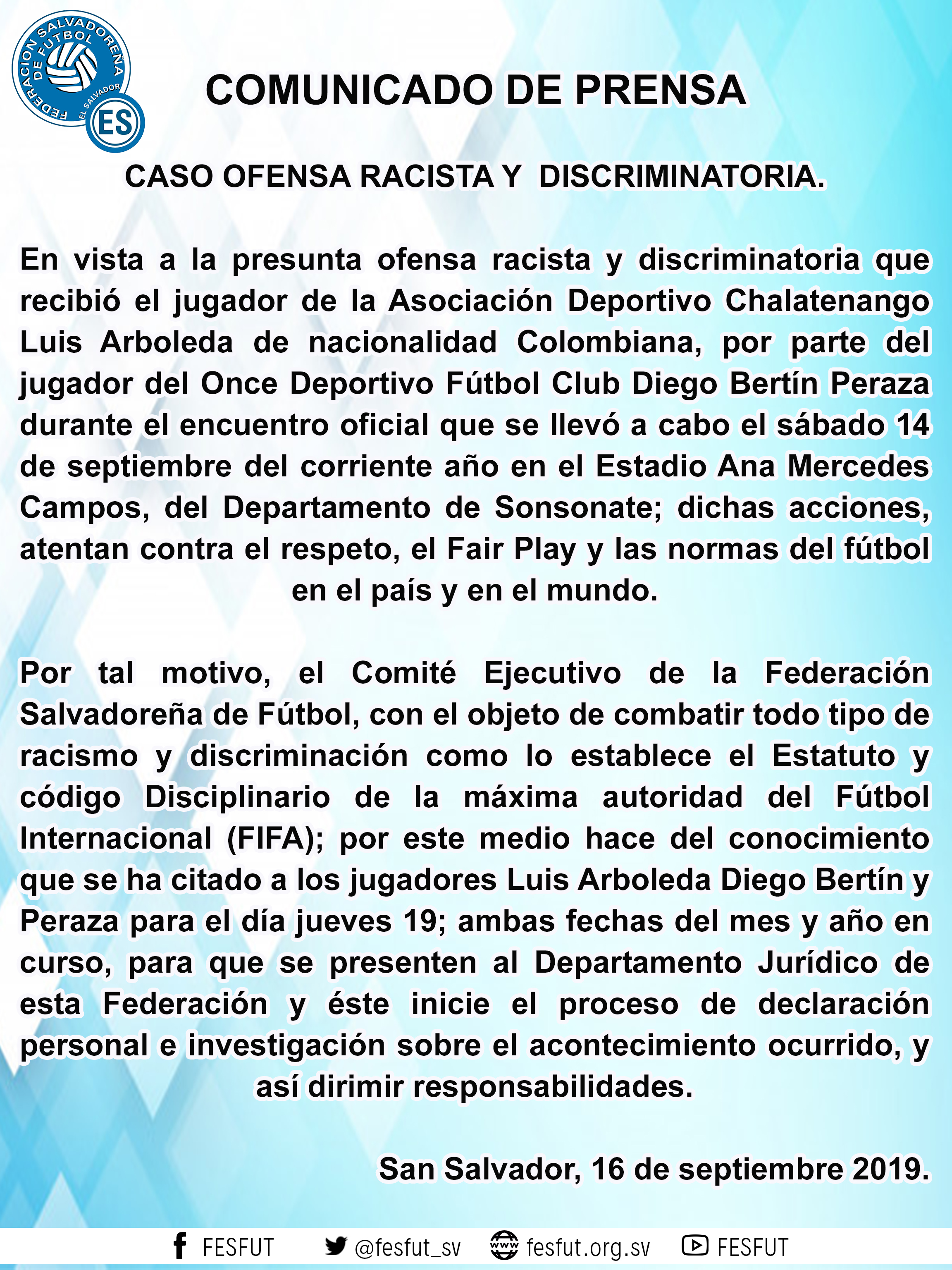 Por tal motivo, el Comité Ejecutivo de la Federación Salvadoreña de Fútbol, con el objeto de combatir todo tipo de racismo y discriminación como lo establece el Estatuto y código Disciplinario de la máxima autoridad del Fútbol Internacional (FIFA); por este medio hace del conocimiento que se ha citado a los jugadores Luis Arboleda Diego Bertín y Peraza para el día jueves 19; ambas fechas del mes y año en curso, para que se presenten al Departamento Jurídico de esta Federación y éste inicie el proceso de declaración personal e investigación sobre el acontecimiento ocurrido, y así dirimir responsabilidades.