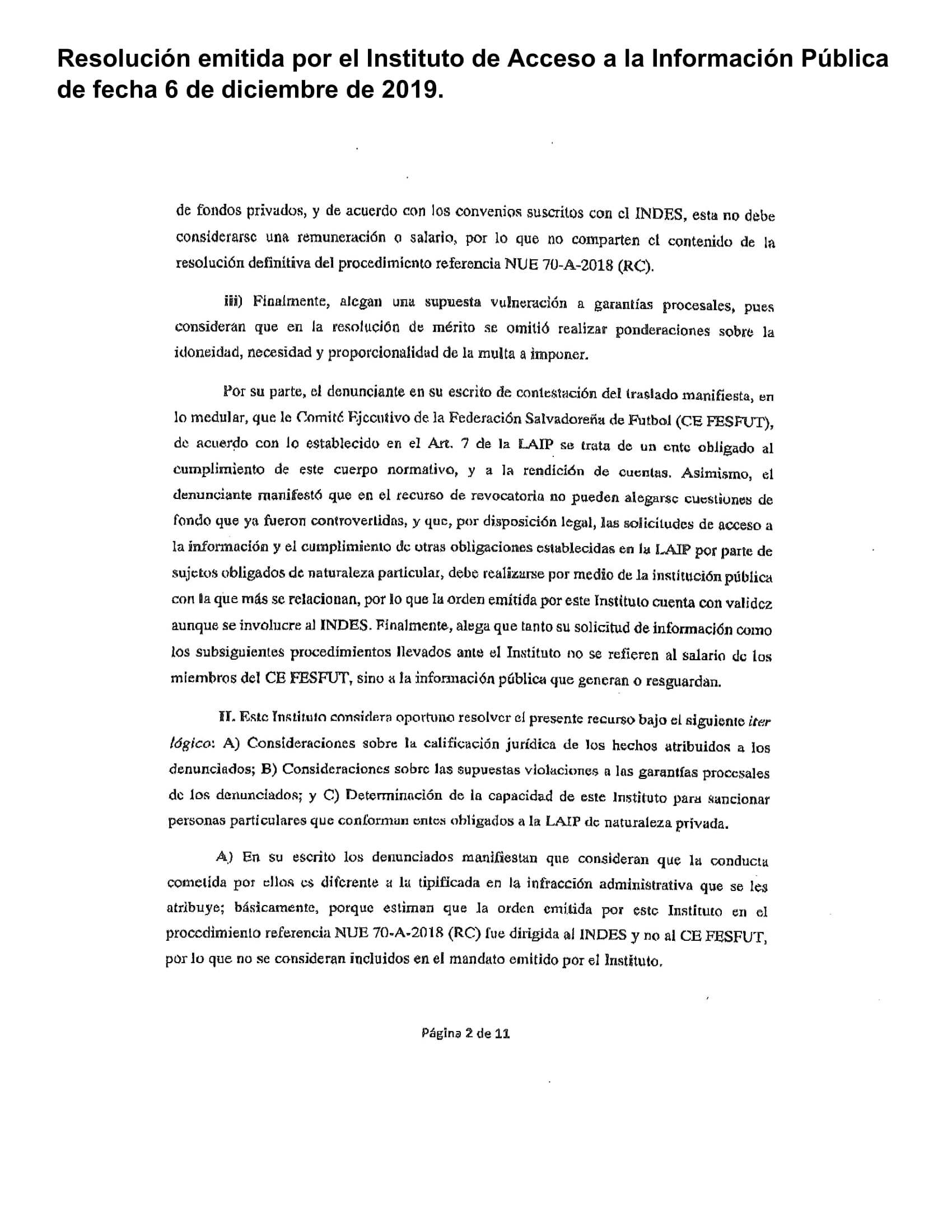1) La Resolución Definitiva NUE 37-D-2018 (MM) en su romano II expresa literalmente lo siguiente «El Instituto considera oportuno resolver el presente recurso bajo el siguiente iter lógico: A) Consideraciones sobre la calificación jurídica de los hechos atribuidos a los denunciados; B) Consideraciones sobre las supuestas violaciones a las garantías procesales de los denunciados; y C) Determinación de la capacidad de este Instituto para sancionar personas particulares que conforman entes obligados a la LAIP de naturaleza privada»; sobre estas condiciones el Instituto de Acceso a la Información Pública desarrolló su dictamen, en ninguna otra más, como maliciosamente se pretende dar a conocer a la población salvadoreña.