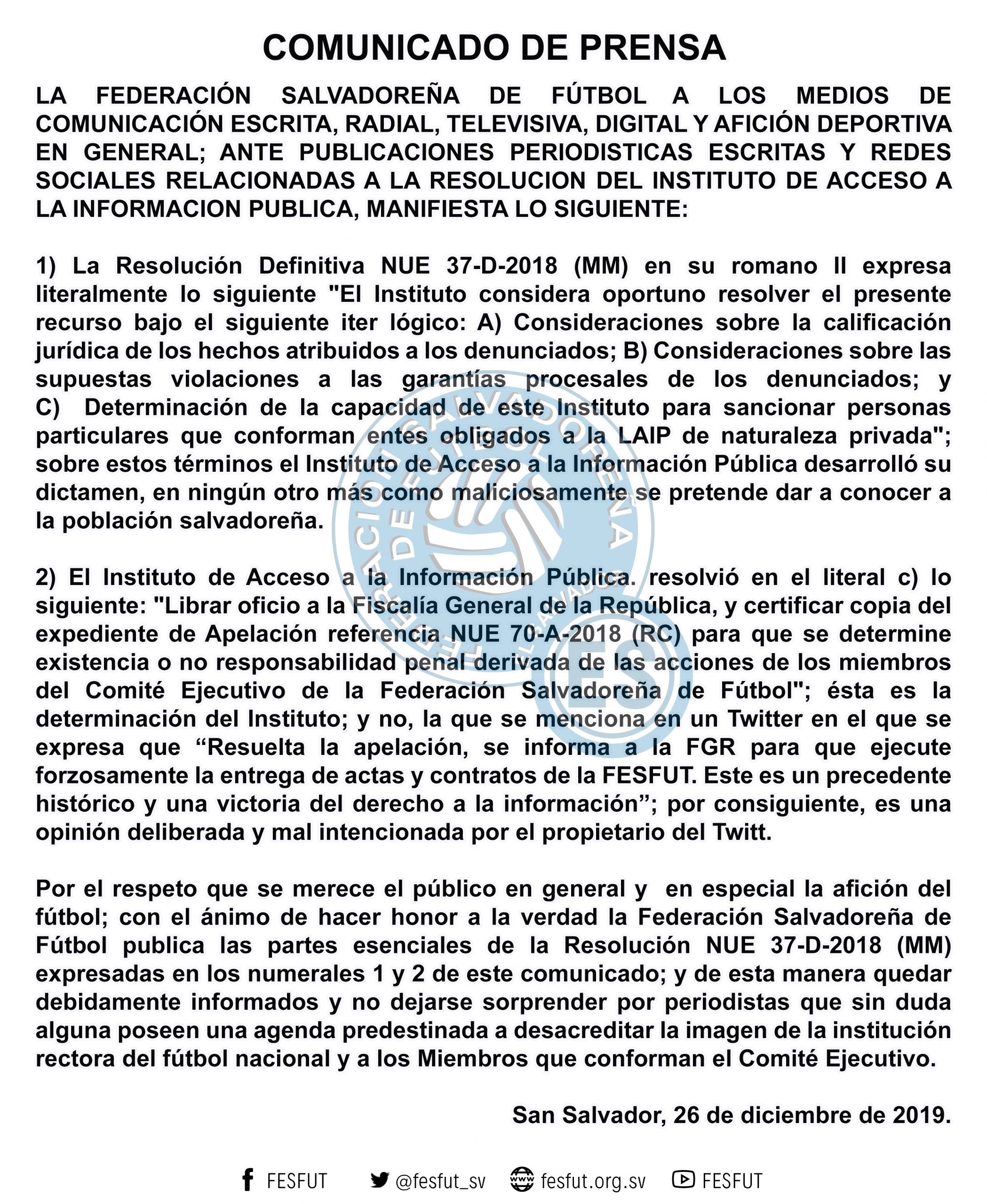 LA FEDERACIÓN SALVADOREÑA DE FÚTBOL A LOS MEDIOS DE COMUNICACIÓN ESCRITA, RADIAL, TELEVISIVA, DIGITAL, Y AFICIÓN DEPORTIVA EN GENERAL; ANTE PUBLICACIONES PERIODÍSTICAS EN MEDIO ESCRITO Y EN REDES SOCIALES RELACIONADAS A LA RESOLUCIÓN DEL INSTITUTO DE ACCESO A LA INFORMACIÓN PUBLICA, MANIFIESTA LO SIGUIENTE: