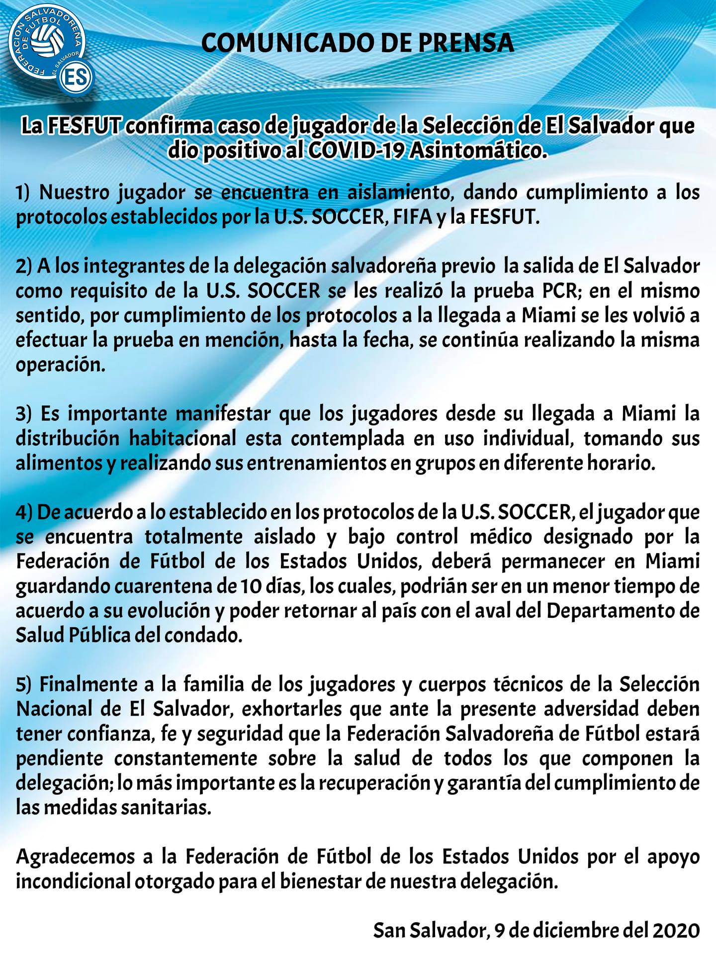 5) Finalmente a la familia de los jugadores y cuerpos técnicos de la Selección Nacional de El Salvador, exhortarles que ante la presente adversidad deben tener confianza, fe y seguridad que la Federación Salvadoreña de Fútbol estará pendiente constantemente sobre la salud de todos los que componen la delegación; lo más importante es la recuperación y garantía del cumplimiento de las medidas sanitarias. Agradecemos a la Federación de Fútbol de los Estados Unidos por el apoyo incondicional otorgado para el bienestar de nuestra delegación.