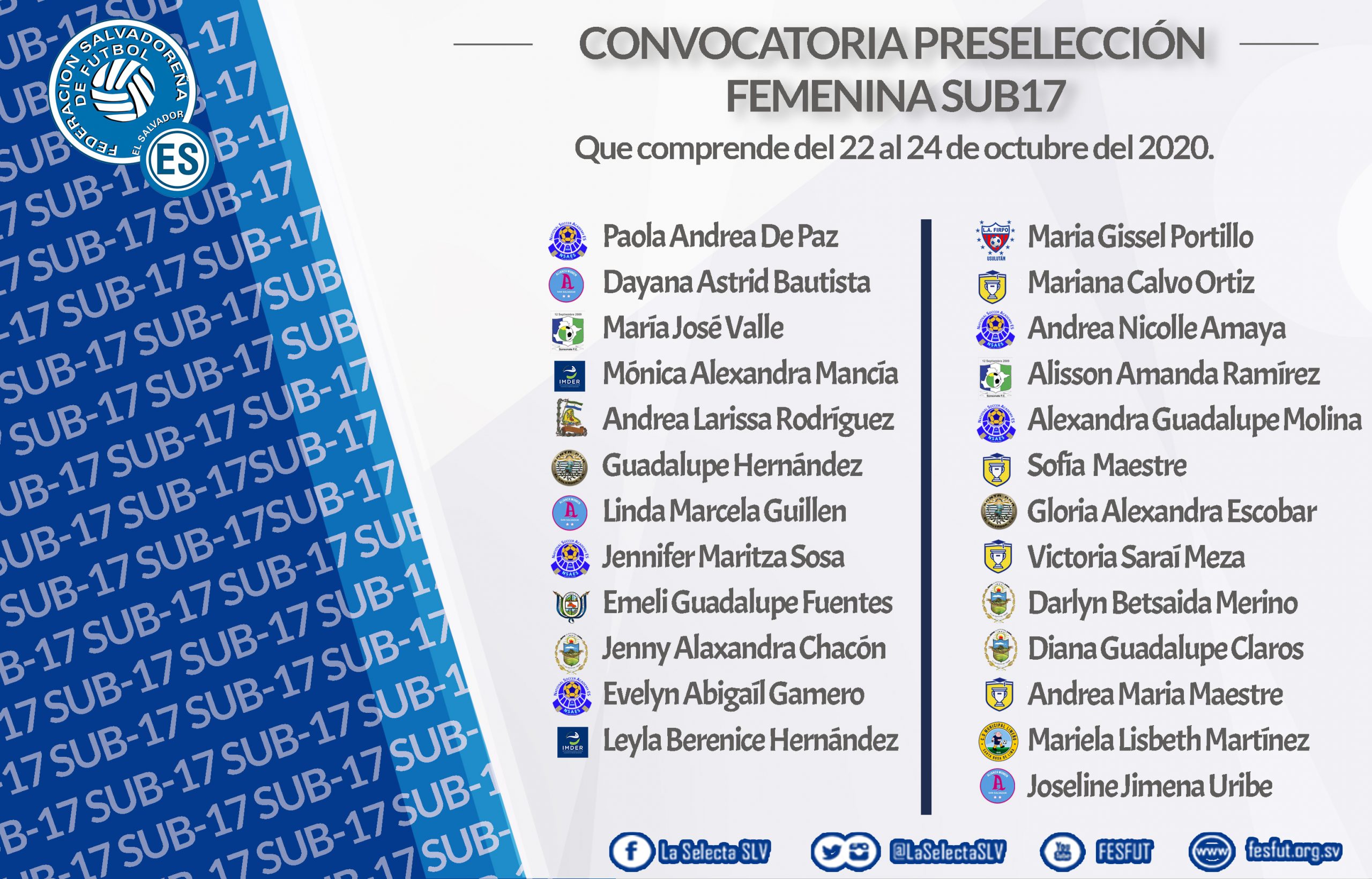 Ver imagen más grande Convocatoria Preselección Femenina Sub17 El Salvador Convocatoria para microciclo de trabajo de la Preselección Nacional Femenina Sub17 que comprende del 22 al 24 de octubre del 2020. Los jugadoras deberán presentarse a las 02:00 p.m. en el Albergue del Futbolista, FESFUT. Por Comunicaciones FESFUT|2020-10-28T16:56:12-06:00octubre 21st, 2020|
