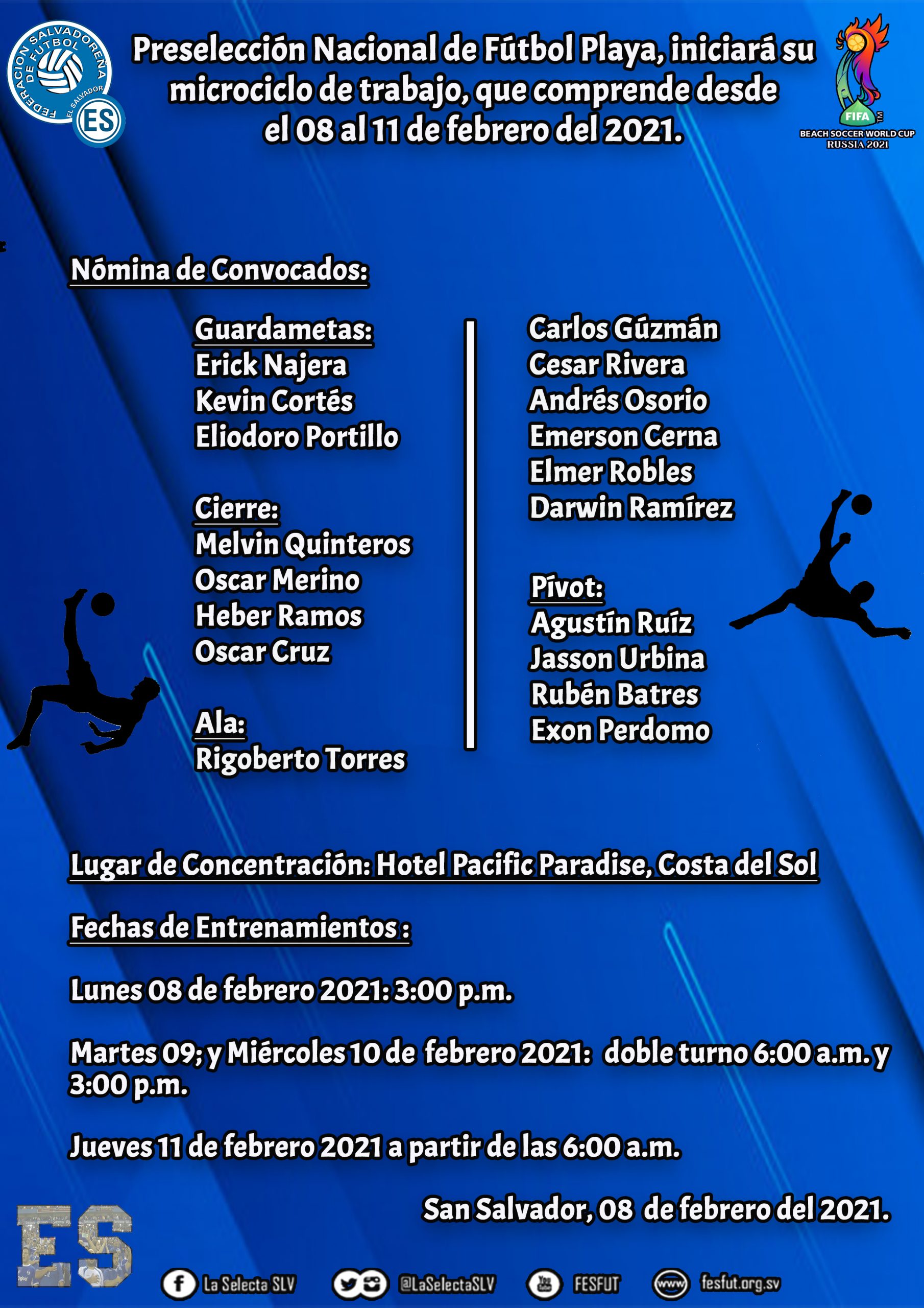El Cuerpo Técnico de la Selección Nacional de Fútbol Playa, dio a conocer nómina de Jugadores convocados para su preparación desde el martes 02 hasta viernes 05 de febrero de 2021.