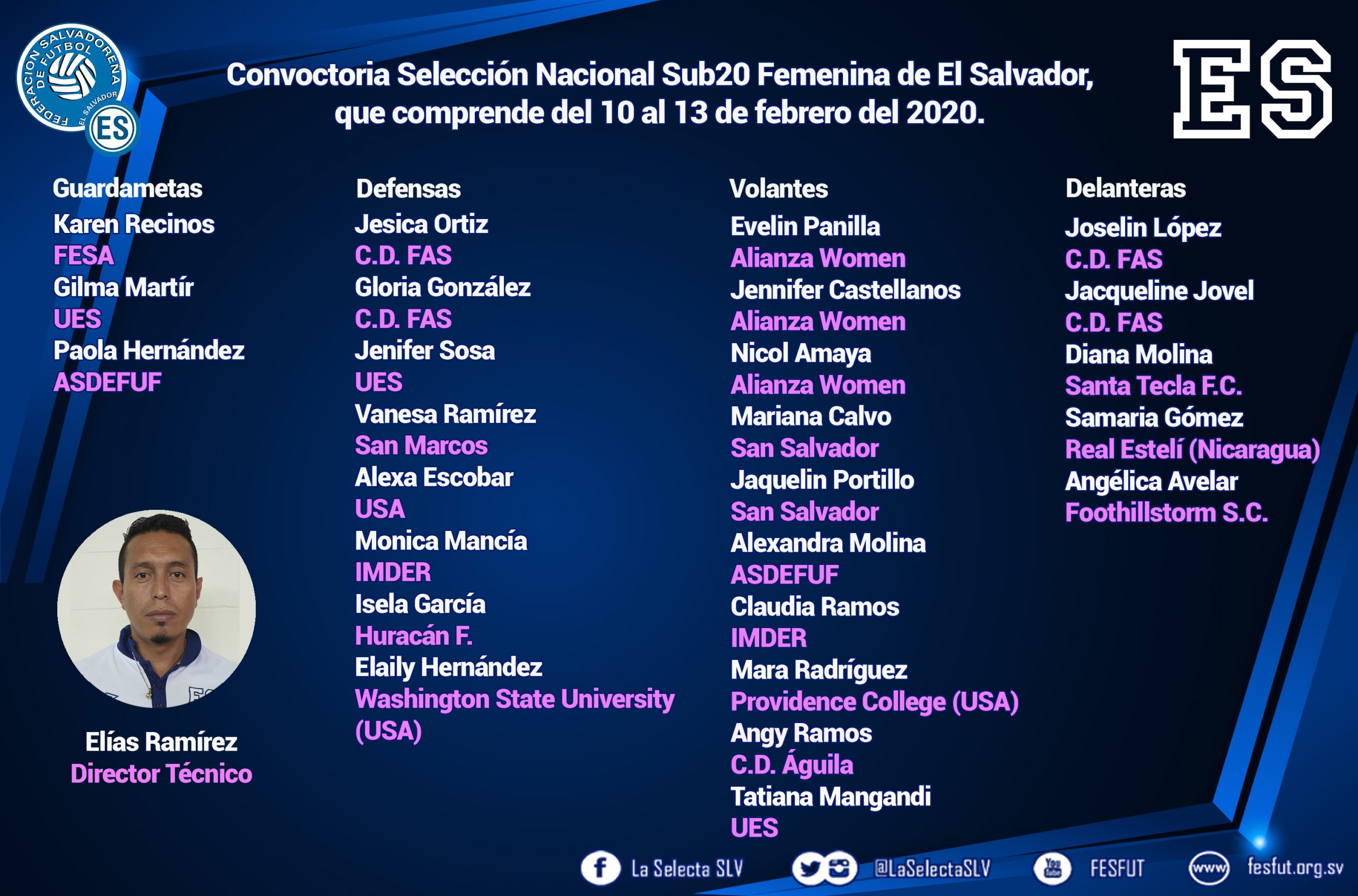 Ver imagen más grande Convocatoria Selección Nacional Femenina Sub20 El Profesor Elías Ramírez, presento nómina para microciclo de trabajo de la Selección Nacional Femenina Sub20 que comprende del 10 al 13 de febrero del 2020. Los jugadoras deberán presentarse a las 12:30 p.m. en el Albergue del Futbolista, FESFUT. Por Comunicaciones FESFUT|2020-02-07T23:20:15-06:00febrero 7th, 2020|