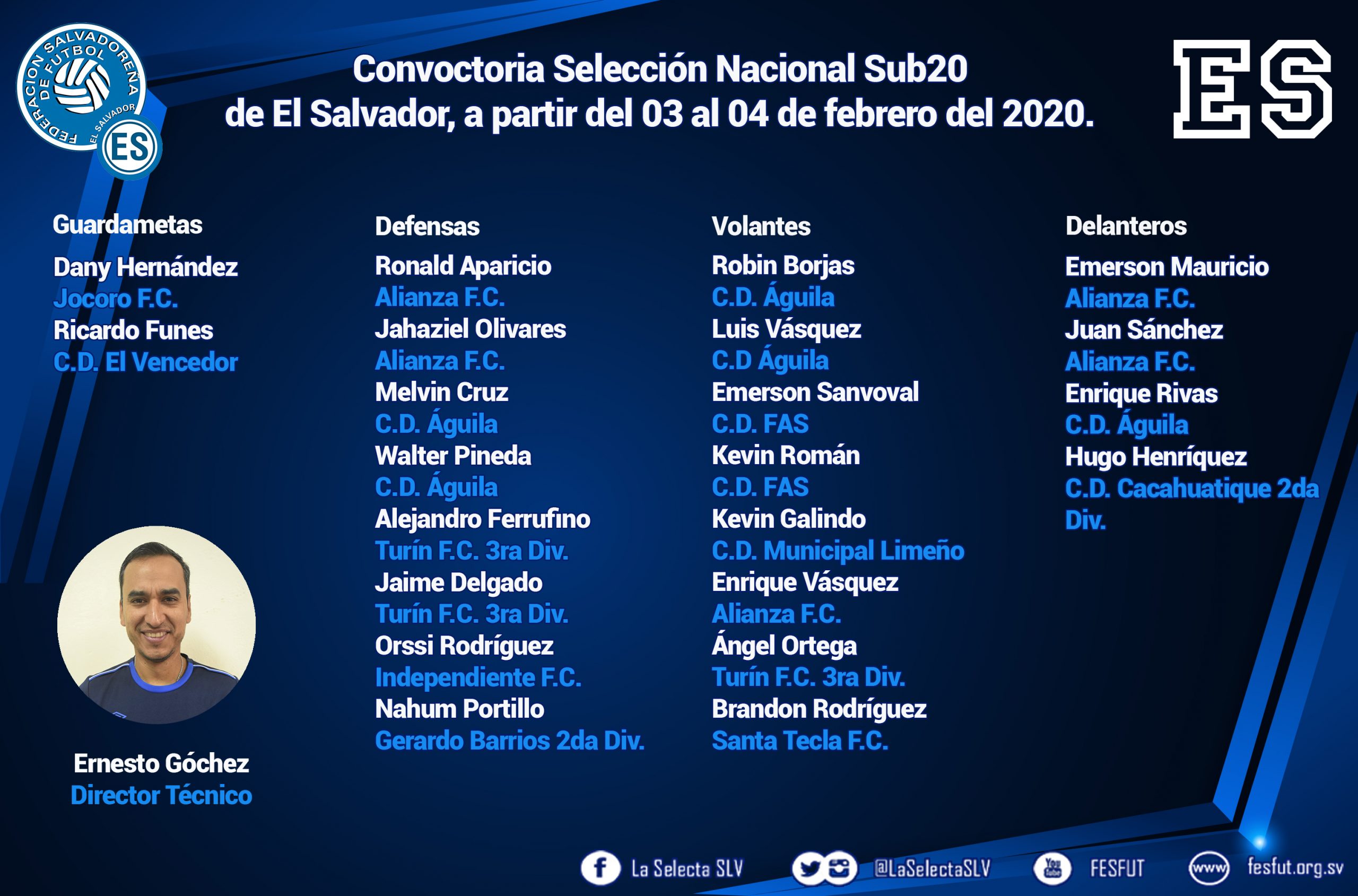 El Profesor Ernesto Góchez, presento nómina para microciclo de trabajo de la Selección Nacional Sub20 que comprende de lunes 03 hasta martes 04 de febrero de 2020.