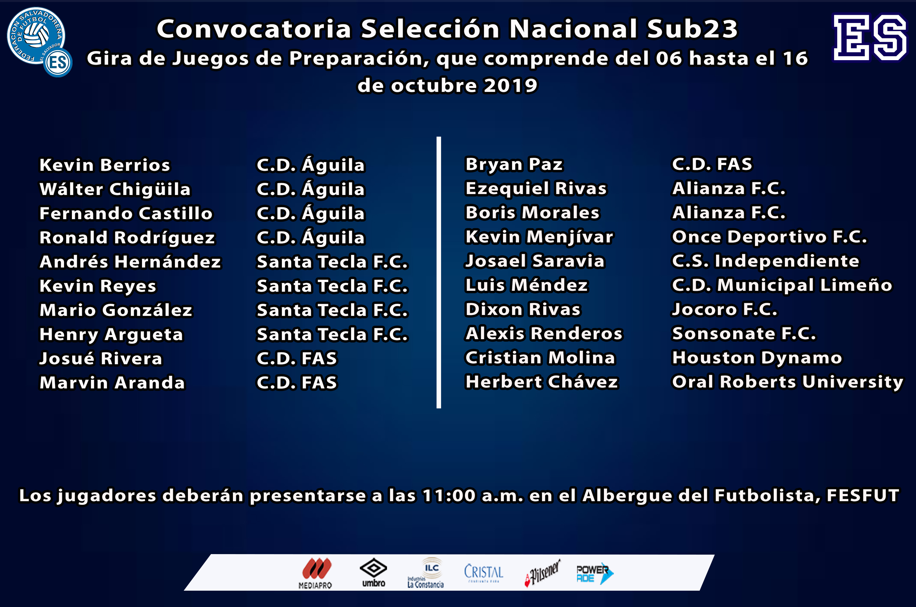 El Profesor Rodolfo Góchez, dio a conocer nómina para Gira de Juegos de Preparación de la Selección Nacional Sub23 que comprende de domingo 06 hasta miércoles 16 de octubre de 2019.