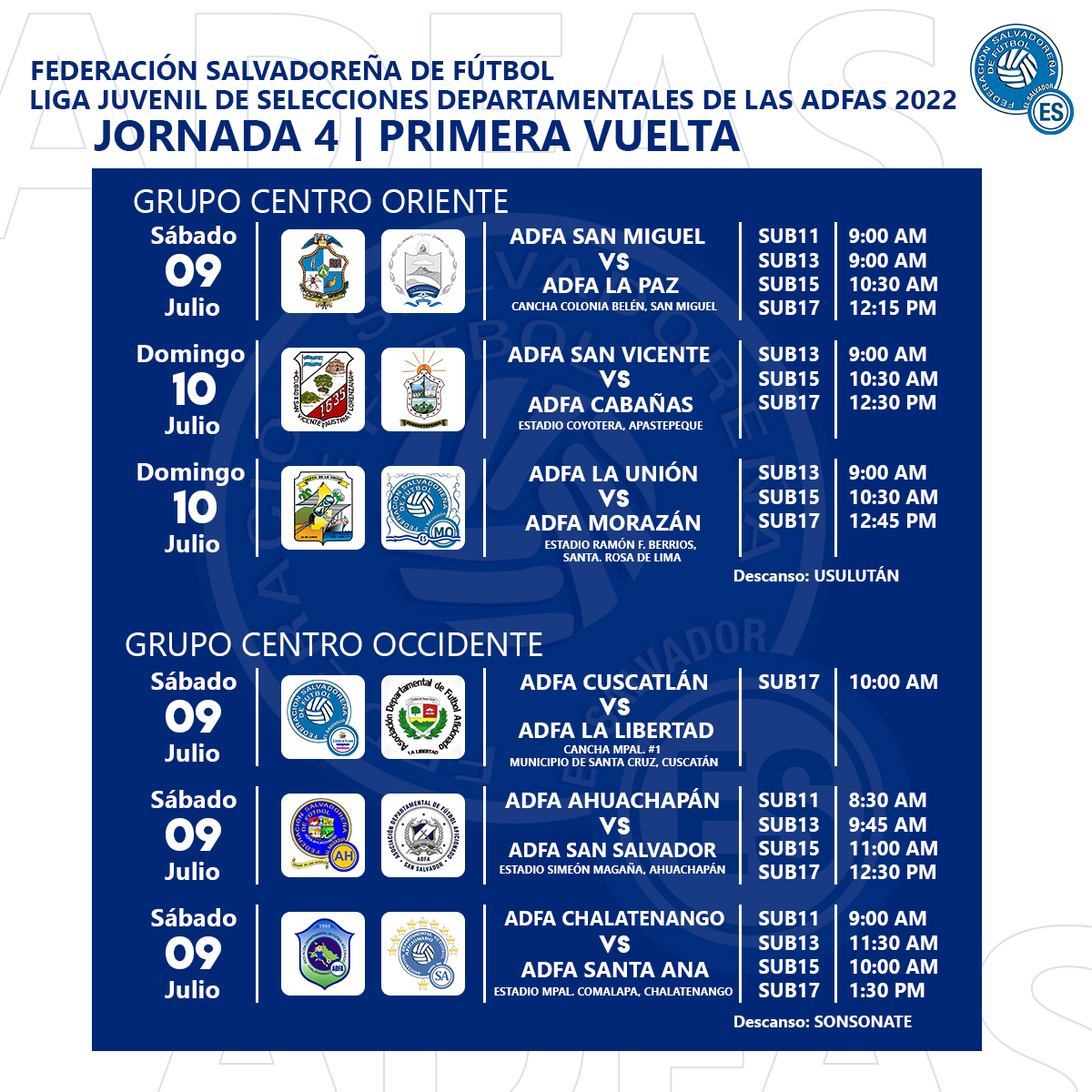 Las Asociaciones Departamentales de Fútbol Aficionado, ADFAS, nacieron con la creación de la Ley del Fútbol Federado de El Salvador, mediante Decreto Legislativo No. 529 del día 30 de agosto del año dos mil uno, publicado en el Diario Oficial el día dieciocho de septiembre del mismo año.