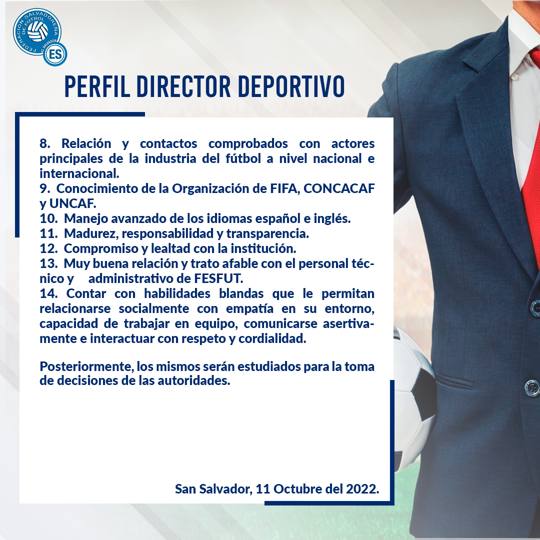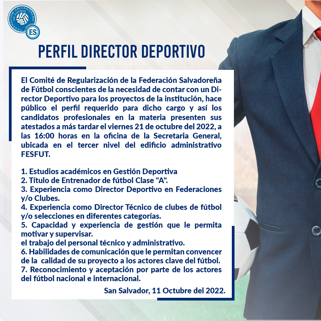El Comité de Regularización de la Federación Salvadoreña de Fútbol conscientes de la necesidad de contar con un Director Deportivo para los proyectos de la institución, hace público el perfil requerido para dicho cargo y así los candidatos profesionales en la materia presenten sus atestados a más tardar el viernes 21 de octubre del 2022, a las 16:00 horas en la oficina de la Secretaria General, ubicada en el tercer nivel del edificio administrativo FESFUT.