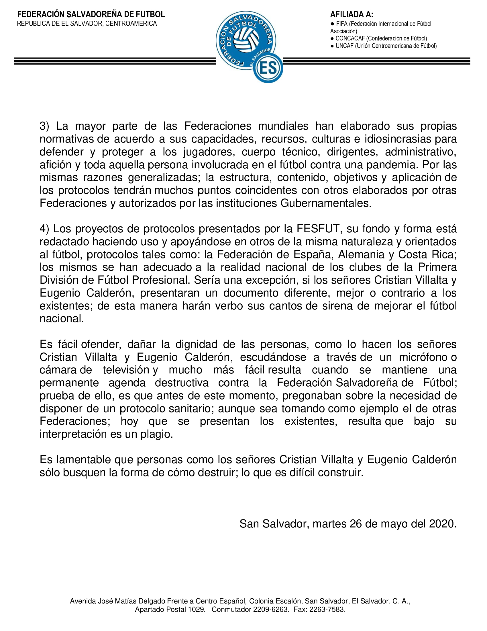 La Federación Salvadoreña de Fútbol ante los comentarios realizados por los señores Cristian Villalta y Eugenio Calderón en el programa radial: Guiri Guiri y la publicación Digital del Periódico: El Gráfico, este martes 26 de mayo de 2020 denominada: «FESFUT plagió los protocolos sanitarios de Costa Rica»; a los medios de Comunicación Escrita, Radial Televisiva, Digital y Afición Deportiva en General; ACLARA: