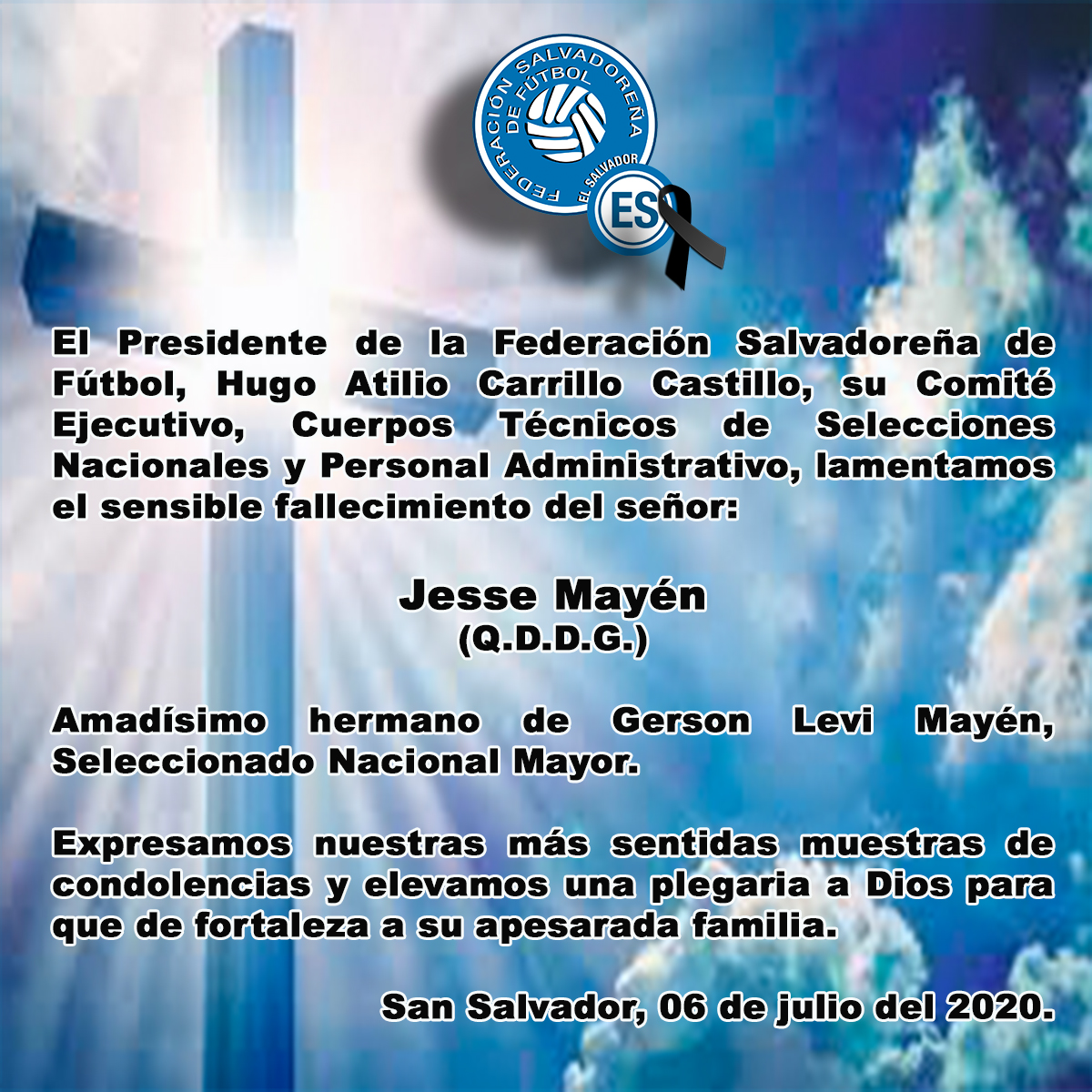 Ver imagen más grande Sentído Pésame Gerson Mayen y extensivo a su familia 🙏🙏🙏 Sentído Pésame Gerson Mayen y extensivo a su familia, por el fallecimiento de su hermano Jesse Mayen (Q.D.D.G.) Por Comunicaciones FESFUT|2020-07-07T18:59:10-06:00julio 6th, 2020|