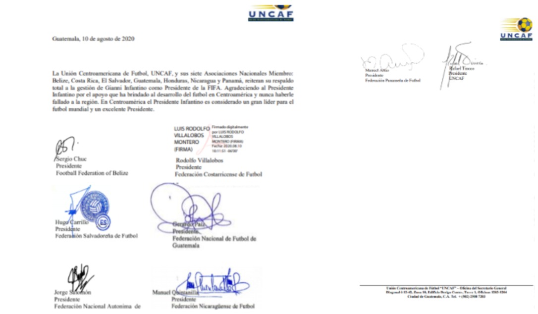 La Unión Centroamericana de Fútbol (Uncaf) reitera y agradece su apoyo a Gianni Infantino, presidente de la Federación Internacional de Fútbol Asociación (Fifa) por el apoyo al futbol centroamericano.